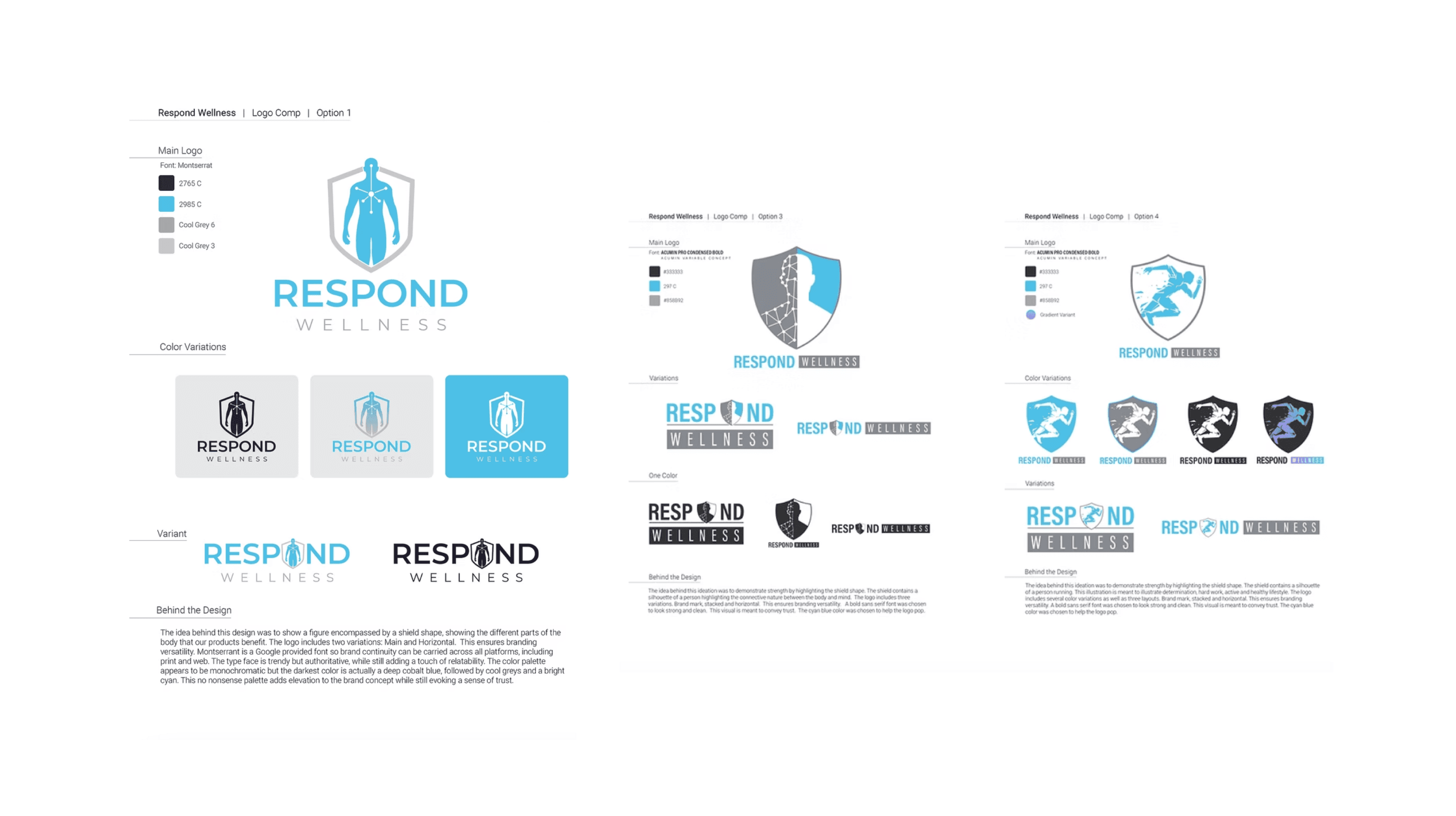 The Respond Wellness logo design was crafted to represent strength, trust, and wellness. The shield shape symbolizes protection and resilience, while the human figure highlights the focus on physical and mental health. The clean typography (Montserrat font) ensures readability and professionalism, while the color palette of deep cobalt blue, cool grays, and bright cyan evokes a sense of reliability and calm. Variations of the logo were created to ensure adaptability across platforms, maintaining brand consistency in both print and digital formats.